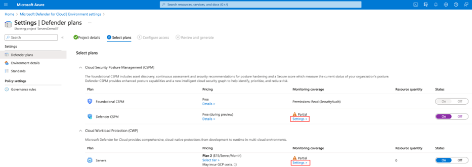 بالنسبة إلى خطة Defender Cloud Security Posture Management (CSPM) أو Defender for Servers P2، حدد الإعدادات.