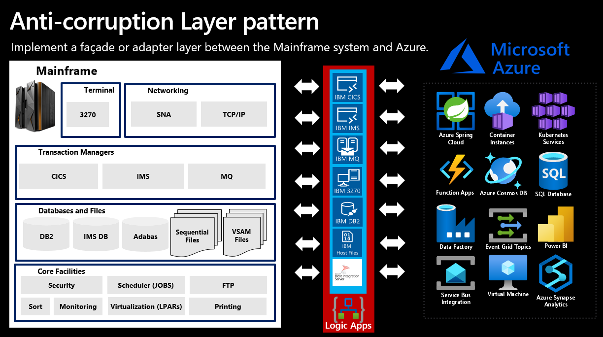 بغض النظر عن نهج التحديث الذي تحدده، تحتاج إلى تنفيذ "طبقة مكافحة الفساد" باستخدام Azure Logic Apps. تصبح هذه الخدمة طبقة الواجهة أو المحول بين النظام القديم المركزي وAzure. من أجل اتباع نهج فعال، حدد أحمال العمل المركزية للتكامل أو التعايش كأحمال عمل تكامل الحاسوب الرئيسي. إنشاء استراتيجية لكل حمل عمل تكامل، وهو مجموعة الواجهات التي تحتاج إلى تمكينها لترحيل تطبيق الحاسوب الرئيسي.