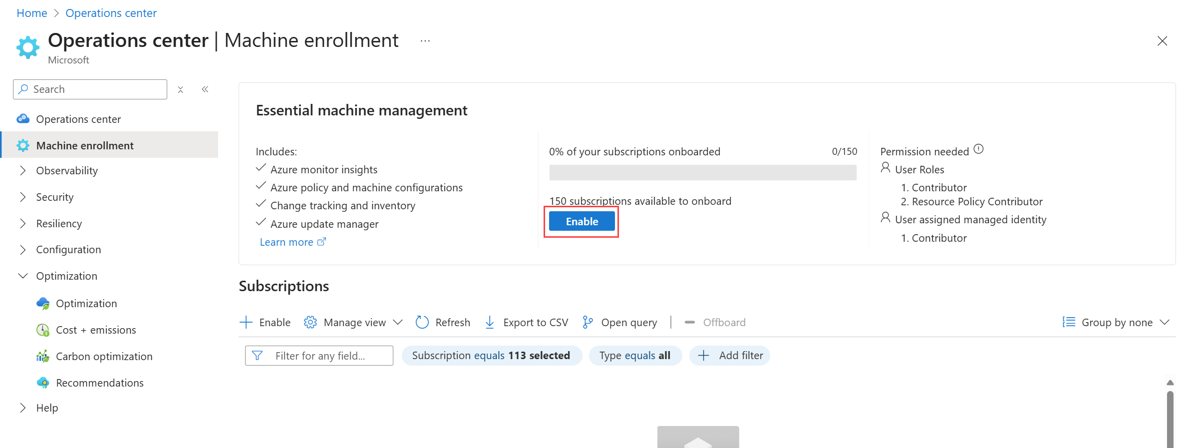 يبسط تسجيل الآلات في عمود التكوينفي مركز العمليات عملية الانضمام وإعداد الإدارة للآلات الافتراضية (VMs) والخوادم القابلة للقوس المغناطيسي في Azure. عند تفعيل اشتراك لتسجيل الآلة، يتم تسجيل جميع الأجهزة الافتراضية والخوادم التي تدعم arc تلقائيا وضبطها بمجموعة مختارة من ميزات الإدارة. هذا يضمن أن أجهزتك مهيأة بشكل متسق للمراقبة والأمان والإدارة.