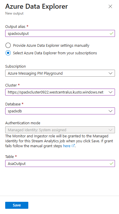 الآن بعد أن تم تكوين هويتك المدارة، فأنت جاهز لإضافة مورد Azure Data Explorer كإخراج لوظيفة Stream Analytics الخاصة بك.