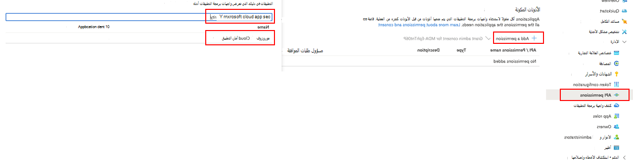 لتمكين تطبيقك من الوصول إلى Defender for Cloud Apps وتعيين إذن "قراءة جميع التنبيهات"، في صفحة التطبيق، حدد أذونات واجهة برمجة التطبيقات إضافة واجهات> برمجة تطبيقاتالأذونات>التي تستخدمها> مؤسستي، واكتب Microsoft أمان التطبيقات على السحابة، ثم حدد Microsoft أمان التطبيقات على السحابة.