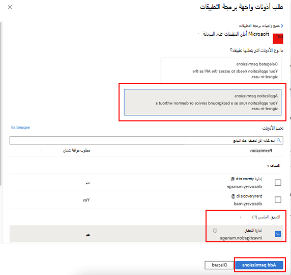 حدد Application permissions>Investigation.Read، ثم حدد Add permissions.