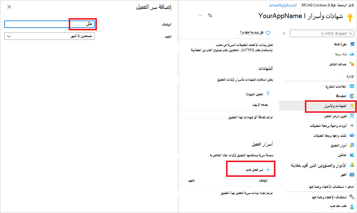 لإضافة سر إلى التطبيق، حدد Certificates & secrets، وحدد New client secret. أضف وصفا إلى البيانات السرية، ثم حدد إضافة.