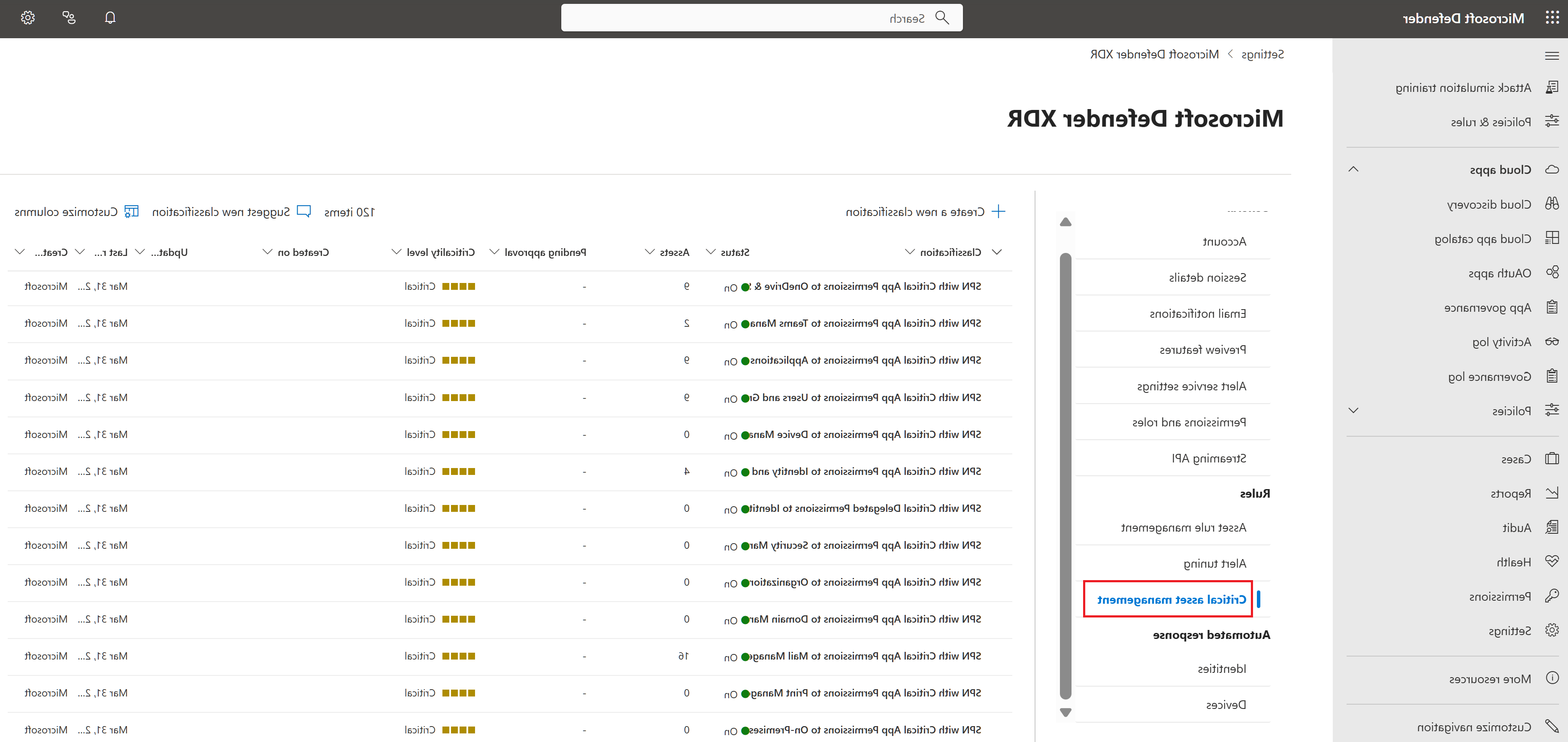 لعرض القائمة الكاملة للأذونات، انتقل إلى مدخل Microsoft Defender وانتقل إلى Settings > Microsoft Defender XDR > Rules > Critical asset management.