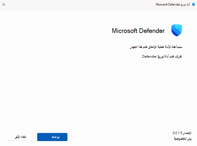 أدخل مفتاح أداة توزيع Defender الذي نسخته من المدخل، ثم حدد متابعة.