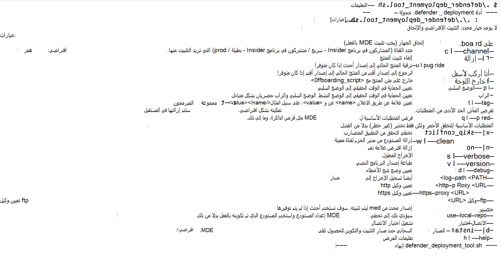 السيناريو أمر التحقق من المتطلبات الأساسية غير المحظورة غير الملباة sudo ./defender_deployment_tool.sh --pre-req-non-blockingتشغيل اختبار الاتصال sudo ./defender_deployment_tool.sh --connectivity-testالتوزيع إلى موقع مخصص sudo ./defender_deployment_tool.sh --install-path /usr/microsoft/التوزيع من القناة البطيئة من الداخل sudo ./defender_deployment_tool.sh --channel insiders-slowالتوزيع باستخدام وكيل sudo ./defender_deployment_tool.sh --http-proxy <http://username:password@proxy_host:proxy_port>نشر إصدار عامل معين sudo ./defender_deployment_tool.sh --mdatp 101.25042.0003 --channel prodالترقية إلى إصدار عامل معين sudo ./defender_deployment_tool.sh --upgrade --mdatp 101.24082.0004الرجوع إلى إصدار عامل معين sudo ./defender_deployment_tool.sh --downgrade --mdatp 101.24082.0004إلغاء تثبيت Defender sudo ./defender_deployment_tool.sh --removeإلحاق فقط إذا كان Defender مثبتا بالفعل sudo ./defender_deployment_tool.sh --only-onboardإيقاف تشغيل Defender sudo ./defender_deployment_tool.sh --offboard MicrosoftDefenderATPOffboardingLinuxServer.py