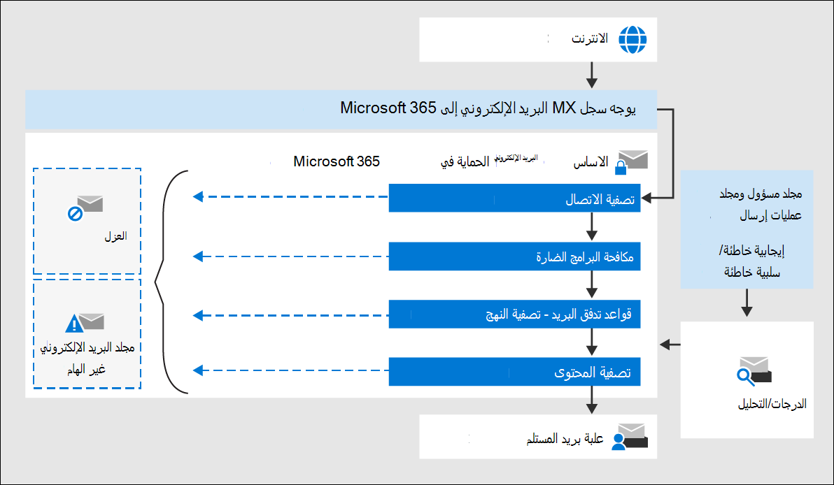 تمر الرسائل الواردة في Microsoft 365 في البداية من خلال تصفية الاتصال، والتي تتحقق من سمعة المرسل. يتم رفض معظم البريد العشوائي في هذه المرحلة. لمزيد من المعلومات، راجع تكوين تصفية الاتصال.