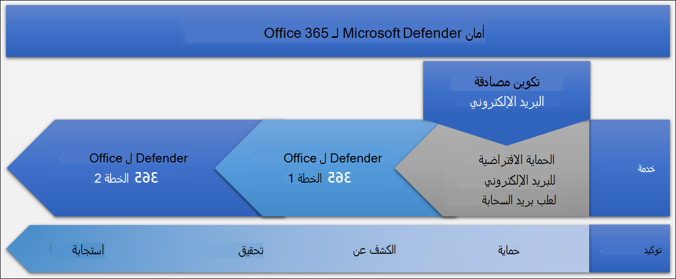 تشرح هذه المقالة سلم الحماية للبريد الإلكتروني والتعاون. يبدأ السلم بميزات الأمان المضمنة لجميع علب بريد السحابة، ويستمر في Defender for Office 365 الخطة 1 وDefender for Office 365 الخطة 2.