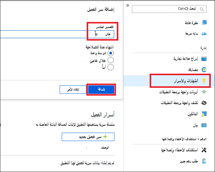 لإضافة سر إلى التطبيق، حدد Certificates & secrets، وأضف وصفا إلى السر، ثم حدد Add.