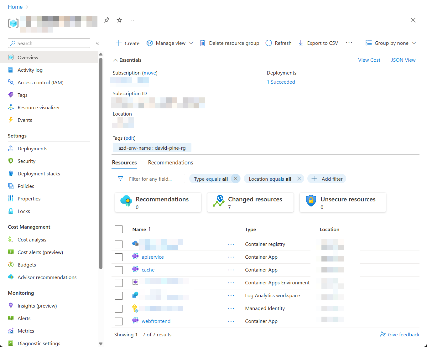 Now that the app has been provisioned and deployed, you can browse to the Azure portal. In the resource group where you deployed the app, you'll see the three container apps and other resources.