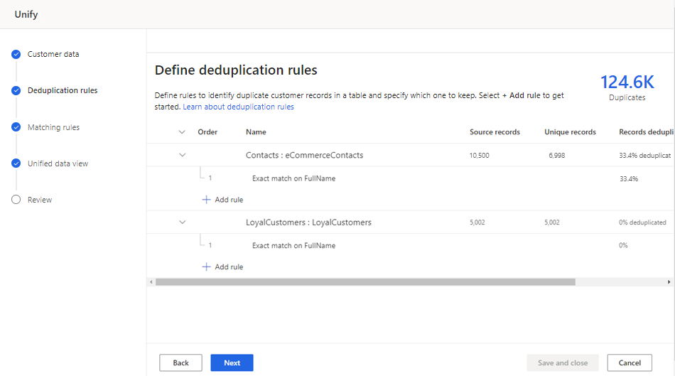 حدد التالي لإجراء تغييرات على قواعد إلغاء التكرار، أو حدد حفظ وإغلاق والعودة إلى تحديث إعدادات التوحيد.