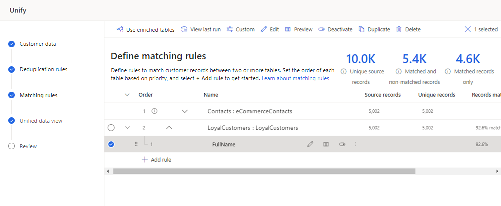 - قم بتشغيل شروط المطابقة فقط لتقييم جودة إلغاء التكرار ومطابقة القواعد بسرعة دون تحديث ملف التعريف الموحد. لا يتم عرض الخيار تشغيل شروط المطابقة فقط لجدول واحد.