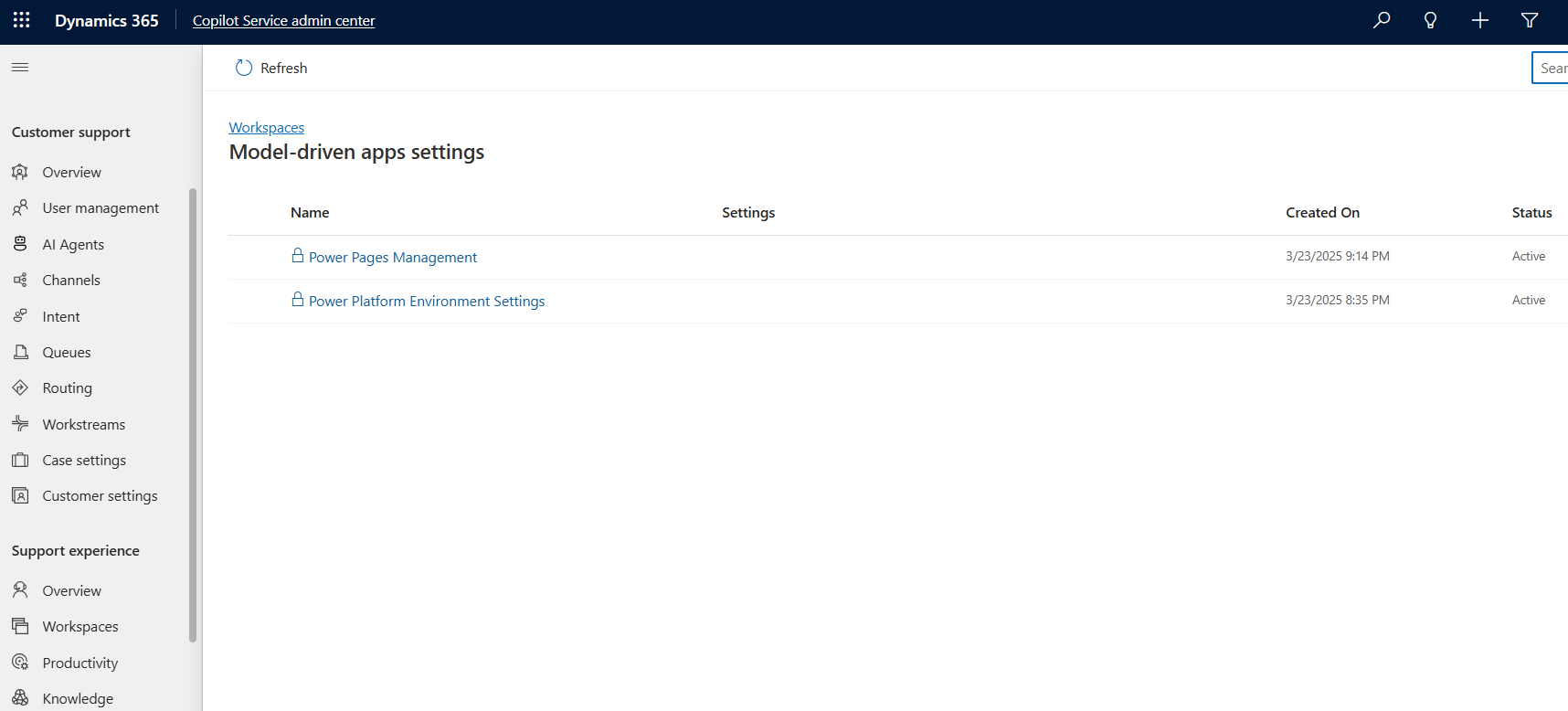 في خريطة موقع مركز إدارة خدمة Copilot، انتقل إلى مساحات العمل.