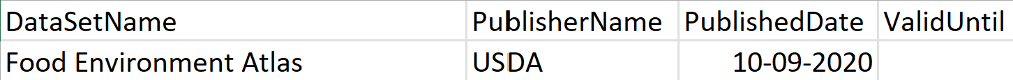 Column Description DataSetName Name of the original dataset. PublisherName Name of the dataset publisher. PublishedDate Date the dataset was published. If the exact day or month is unavailable, use 1st or January as the values. ValidUntil Expiration date of the dataset. When publishers release a new version, the previous version usually becomes invalid. Some publishers may explicitly specify the dataset's validity period. LocationConfiguration: Different geographies define and organize location data in various ways. To help the SDOH pipelines understand your dataset's geographical structure, add a new sheet named LocationConfiguration (if your dataset is in XLSX or XLS format) or create a new CSV file (if your dataset is in CSV format) with the columns displayed in the following example: