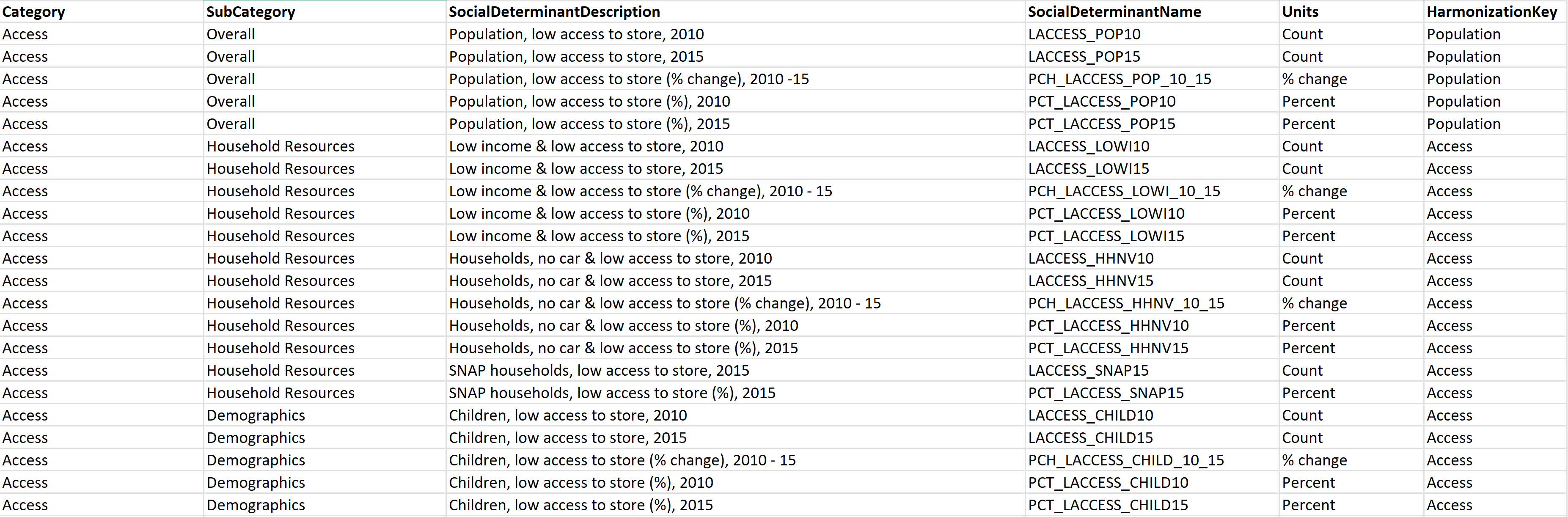 Column Description SocialDeterminantName Contains the column names representing social determinant values in the raw dataset. Category Specify the desired category of the social determinant, such as Housing or Access. These values are often reflected in the sheet names of the raw dataset. SubCategory Provide the subcategory of the social determinant, like Household Resources or Food, representing access to household resources and food. SocialDeterminantDescription Describe the meaning of the social determinant. Since column names in the raw dataset may use short codes, this field clarifies their meaning. Units Specify the unit of the social determinant. HarmonizationKey Add an annotation or tag representing the category of each SDOH metric based on your business logic. Unlike Category, which is often determined by the publisher, the harmonization key allows you to group social determinants. For example, you might assign Demographics as a harmonization key for Total weighted population, even if the publisher categorizes it as Supplemental data-state. DataSetMetadata: As SDOH datasets come from different publishers, recording key details about the dataset is crucial. Add a new sheet named DataSetMetadata (if your dataset is in XLSX format) or create a new CSV file (if your dataset is in CSV format) with the columns displayed in the following example: