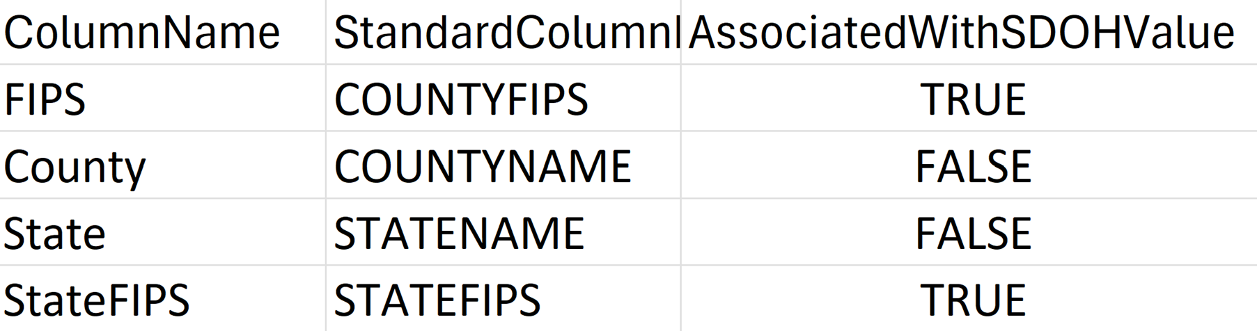 Column Description ColumnName Name of the location-related column as depicted in the raw dataset. StandardColumnName The standard name for the location you wish to use in the silver lakehouse. It's important to have this standardization as different datasets use different column names to depict the same information. For example, Dataset A uses FIPSto depict County FIPS and Dataset B usesFIPSCDto depict County FIPS. Assigning the same value, such as COUNTYFIPS, for StandardColumnName to both fields lets you retrieve the social determinant information from these disjoint datasets based on the common attribute County FIPS.AssociatedWithSDOHValue A flag to understand whether the social determinant value is calculated at that location-level. There's always one row with the flag value set to TRUE.