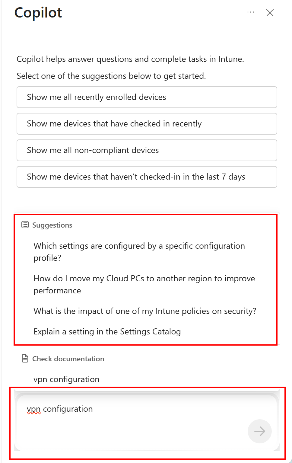 Copilot Chat allows you to ask a question directly to the Microsoft documentation. As you type, the prompt in the Check documentation section dynamically updates to the question you're typing. Select this prompt to learn more in the Microsoft documentation.