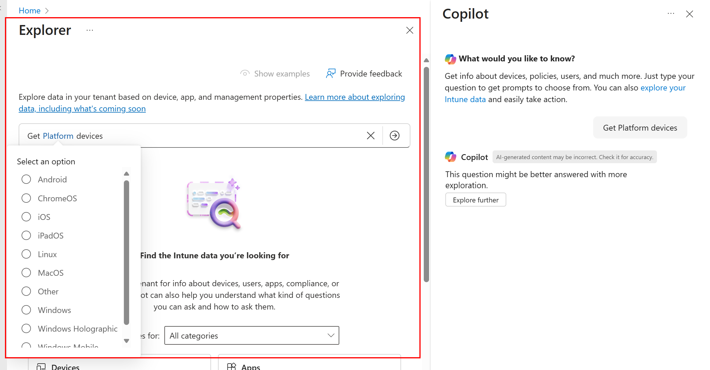 To learn more, see Explore Intune data and get Copilot recommendations.