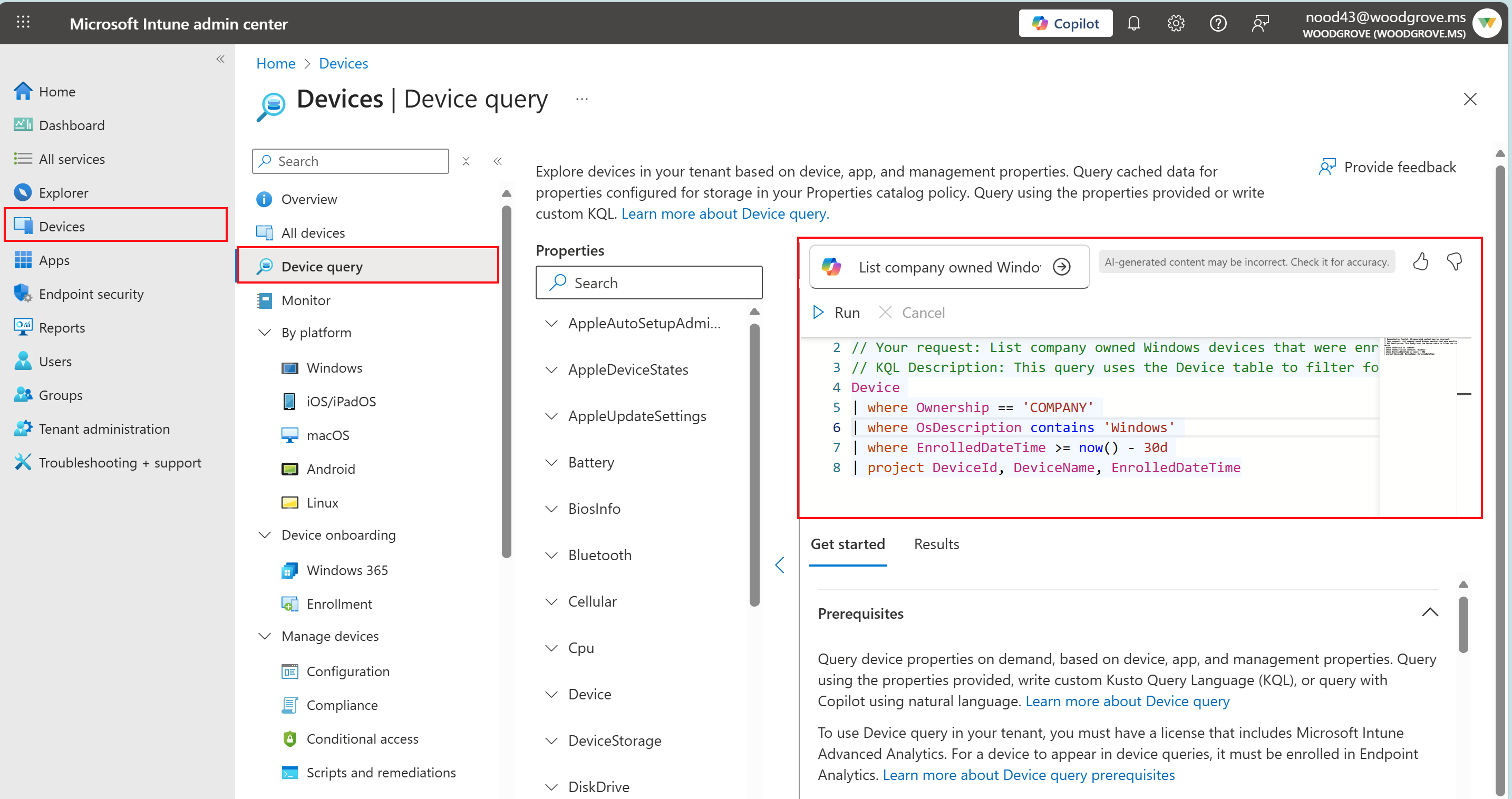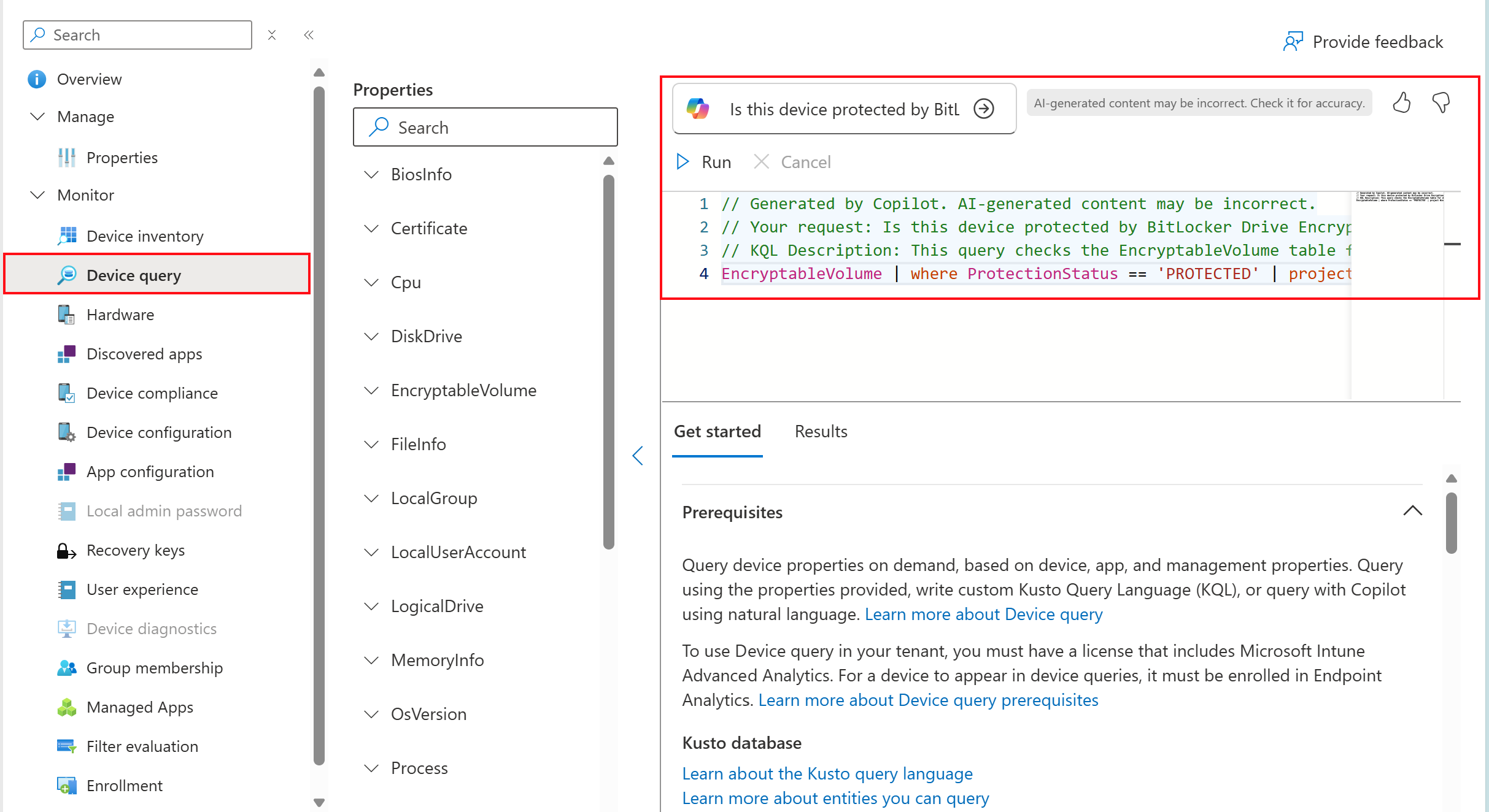 You can use Copilot to help you create Kusto Query Language (KQL) queries to run when using device query in Intune.