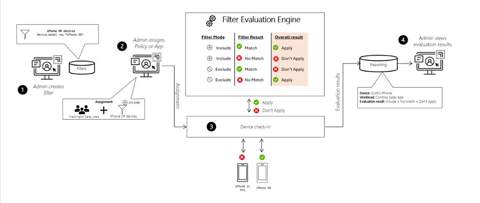Before you apply a policy to an app or device, assignment filters dynamically evaluate applicability. Here's an overview of the image: