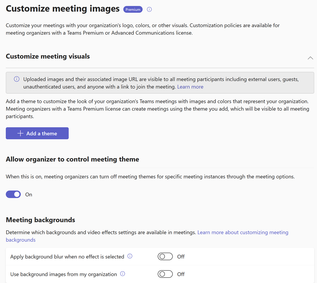 | End-to-end meeting encryption | Not enabled, but users can enable | This setting determines whether end-to-end encrypted meetings are available for users. This setting requires a Teams Premium license. Read more about how to require end-to-end encryption for sensitive Teams meetings. |