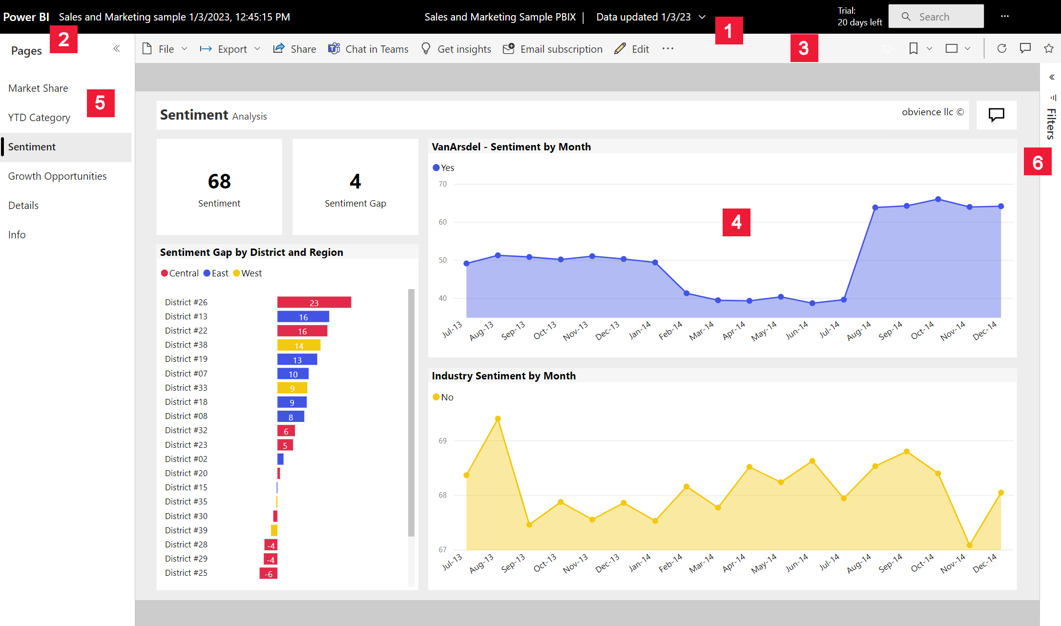 You can explore the associated workspace if you've been given access. When you install or download a template app, the Power BI service creates a workspace for you. When you install an organizational app, it might not include access to the workspace. For more information, see Collaborate in workspaces. Select Power BI (number 2) to return to Home and choose Workspaces.
