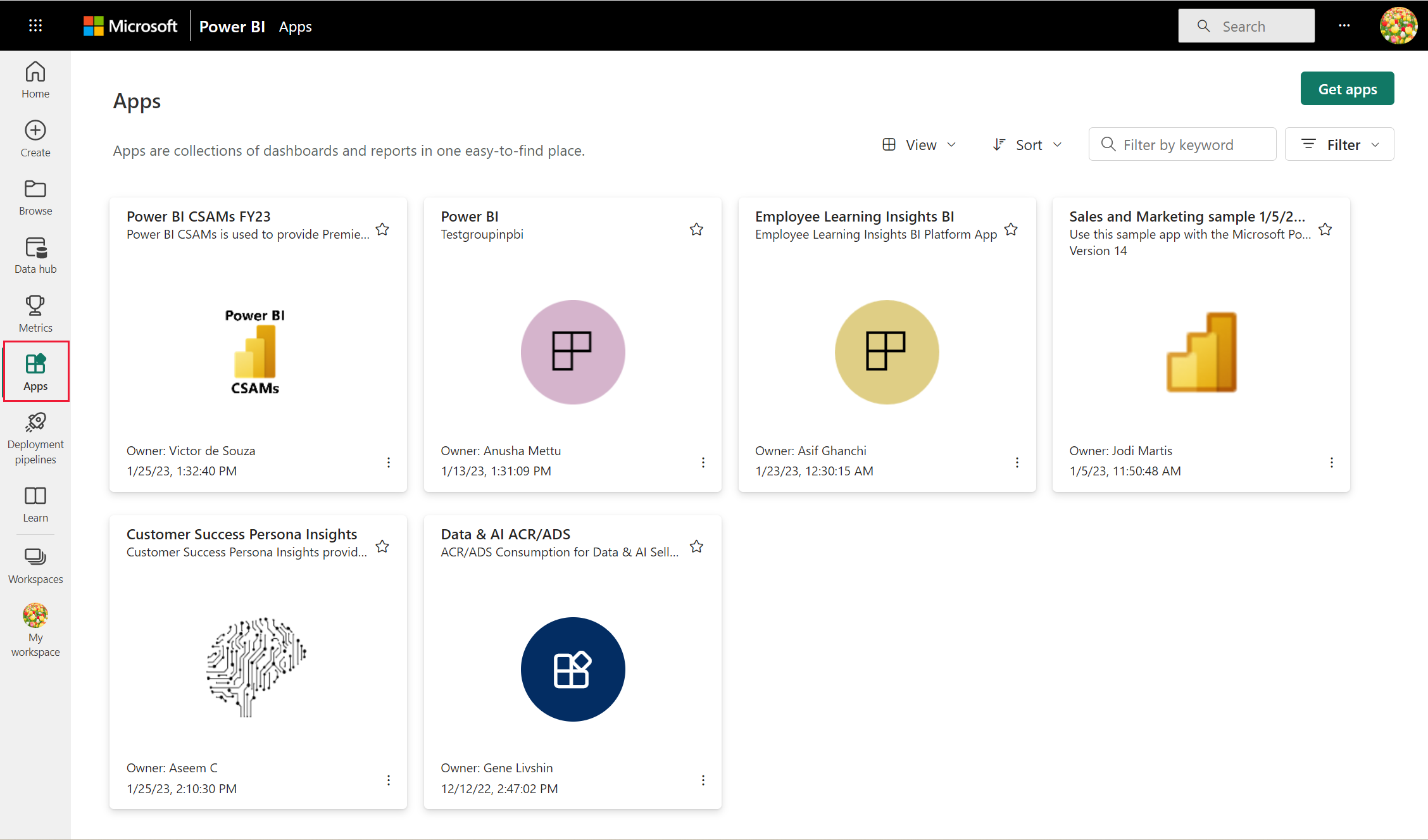 If you're brand new to Power BI, your App page looks like the following example. If you already have apps installed, select Get apps from the upper right corner of the page.The Power BI apps marketplace opens.