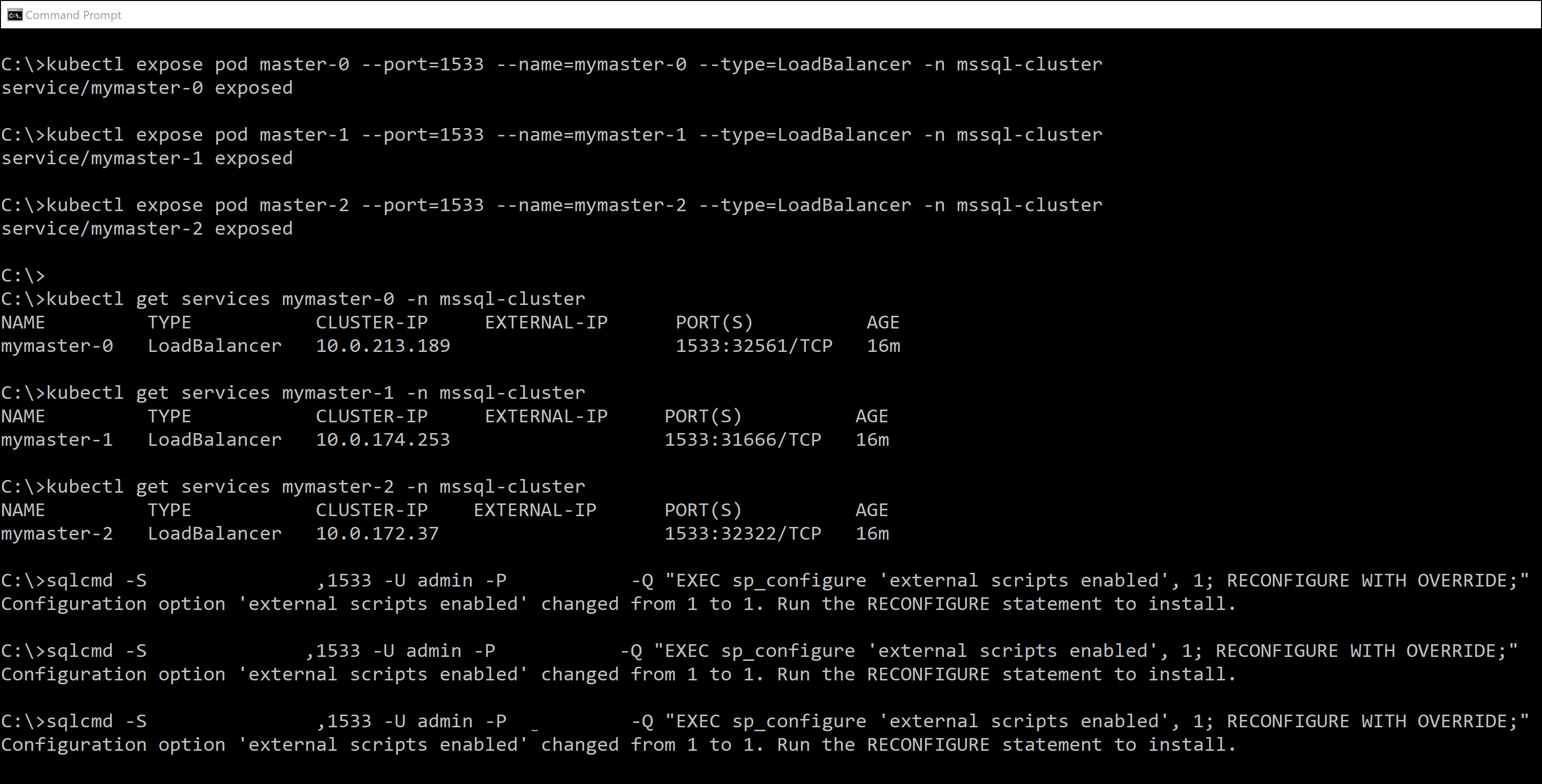 kubectl get services mymaster-0 -n mssql-cluster kubectl get services mymaster-1 -n mssql-cluster kubectl get services mymaster-2 -n mssql-clusterNote