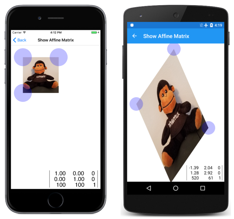 The ShowAffineMatrixPage.xaml file instantiates the SKCanvasView and attaches a TouchEffect. The ShowAffineMatrixPage.xaml.cs code-behind file creates three TouchPoint objects and then sets them to positions corresponding to three corners of a bitmap that it loads from an embedded resource: