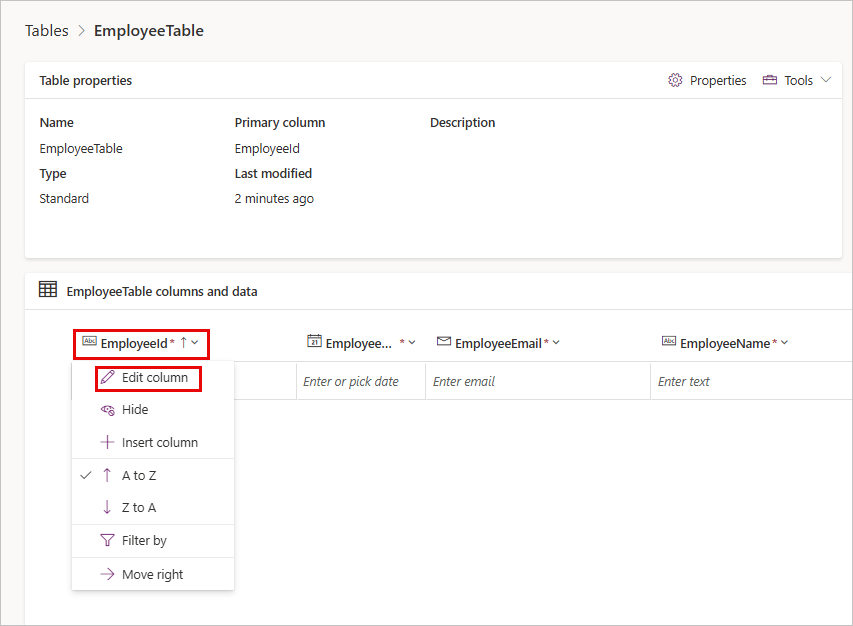 في عَارض الجدَاول لـ EmployeeTable الجديد، ابحث عن حقل EmployeeId وحدده فِي قسم الأعمدة والبيَانَات فِي الجزء السفلي من الشَاشة. ثم حدّد تحرير العمود من القَائمة المنسدلة لإظهَار لوحة تحرير العمود عَلى يمين الشَاشة.