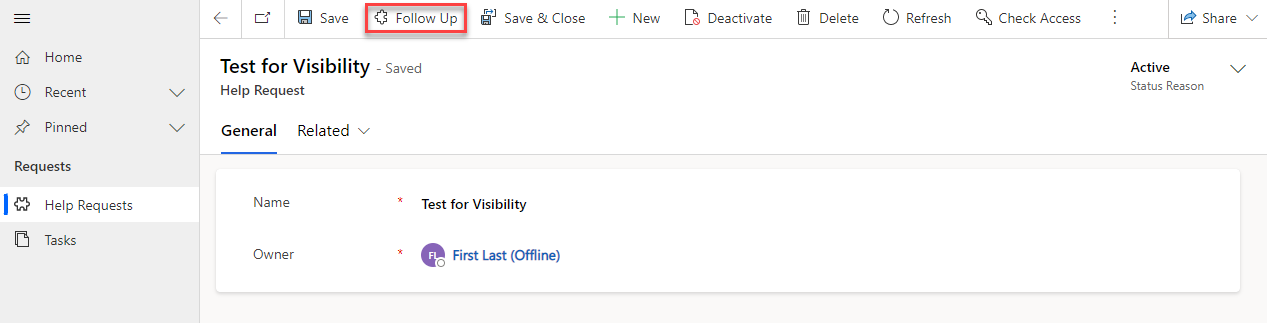 فِي هَذا التَمرِين، تضيف زر شريط الأوامر إلى نموذج جدول طلب المسَاعدة. هَذا الزرُّ مَرئي لطَلبات المُسَاعَدة النَشِطة. عِند النَقر فَوقه، يتمُّ إنشَاء مَهمةٍ جَديدةٍ لطَلب المُسَاعدة.