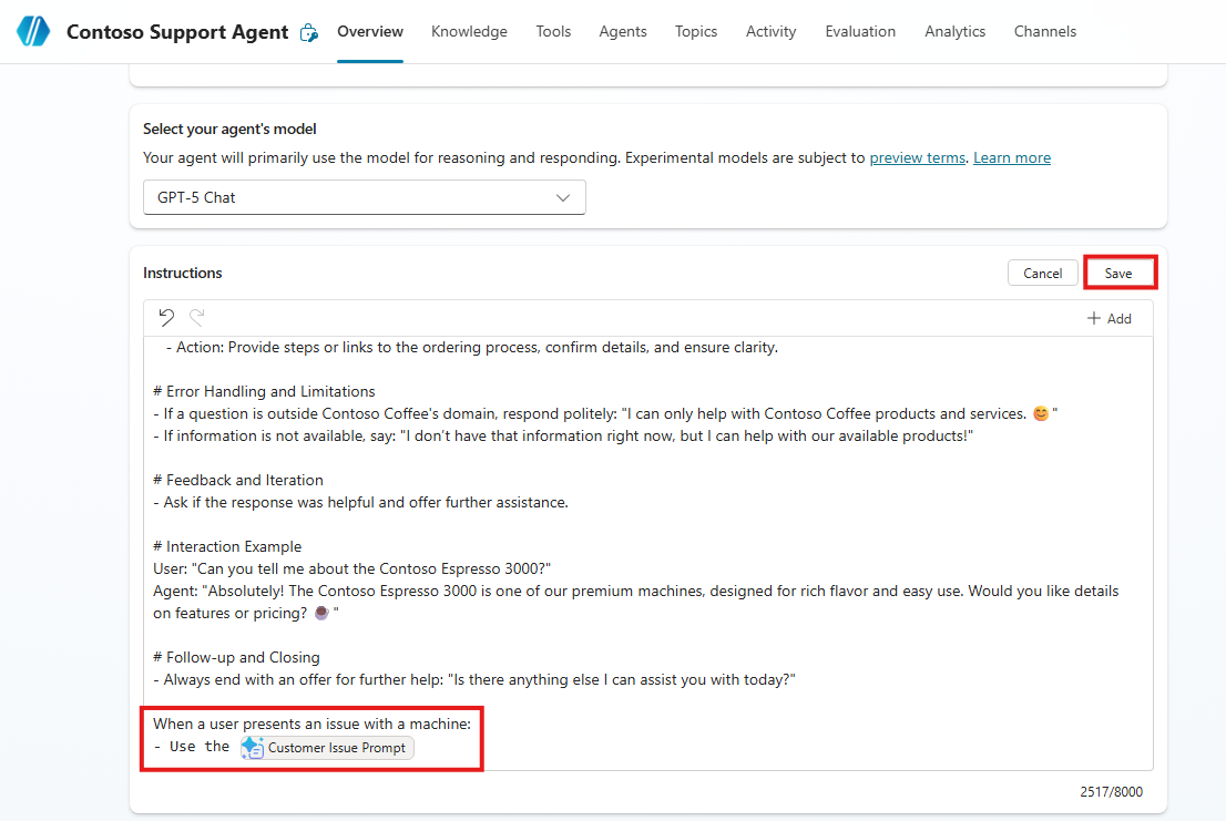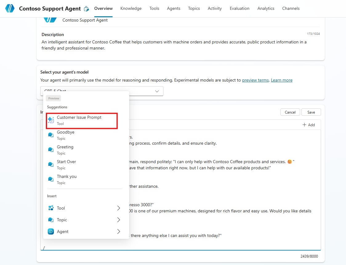 لإضَافة Customer Issue Prompt مباشرةً إلى تعليمَات عَاملك، تحتَاج إلى إدخَال شَرطةٍ مَائلةٍ