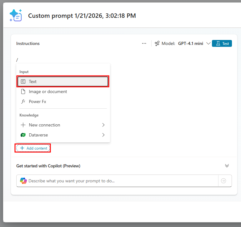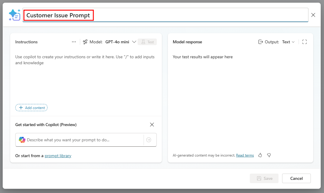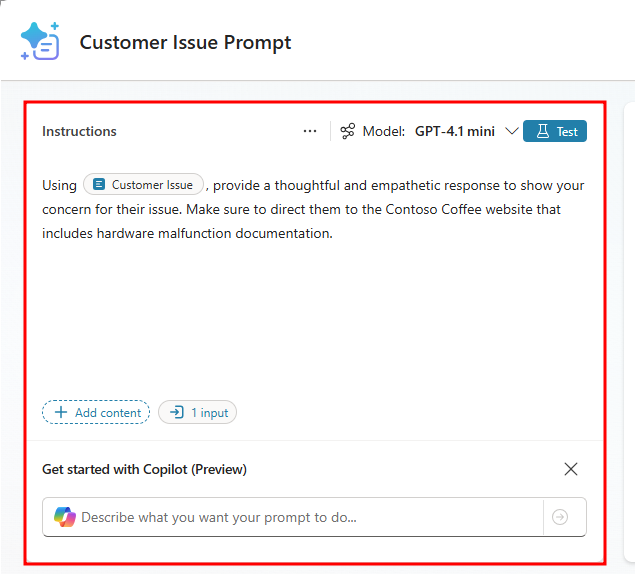 Customer Issue Prompt.فِي قسمِ التَعليمَات، حدّد الزر + إضَافة مُحتَوى لإضَافَة إدخَال نصّ.