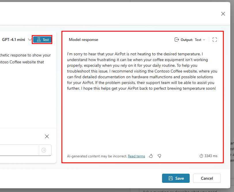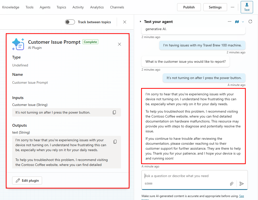 Using [Customer Issue], provide a thoughtful and empathetic response to show your concern for their issue. Make sure to direct them to the Contoso Coffee website that includes hardware malfunction documentation.أنت الآن جَاهز لاختبار أدَاة المُطَالبة هَذه فِي أثنَاء العمل، للقيَام بهَذا، حدّد الزر اختبار.