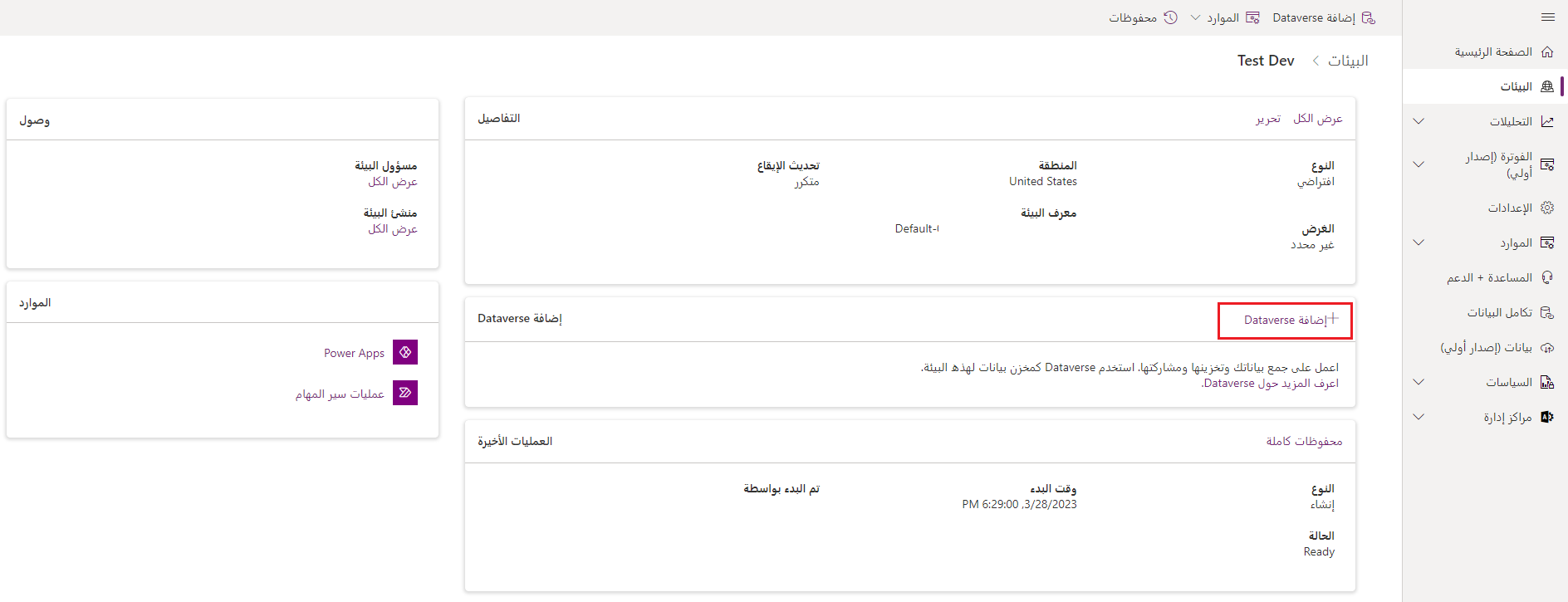 فِي شاشة تفاصيل البيئة، لاحظ وجود لوحة إضافة Dataverse فِي وسط الشاشة. حدد إضافة Dataverse.