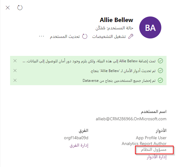 فور حفظ التغييرَات، ستتلقى تأكيدًا فِي الجزء العلوي من شَاشة المستخدمين لديك بأنه قد تَمت إضافة المستخدم وأنه تَم تحديث أدوار الأمَان لهذَا المستخدم.