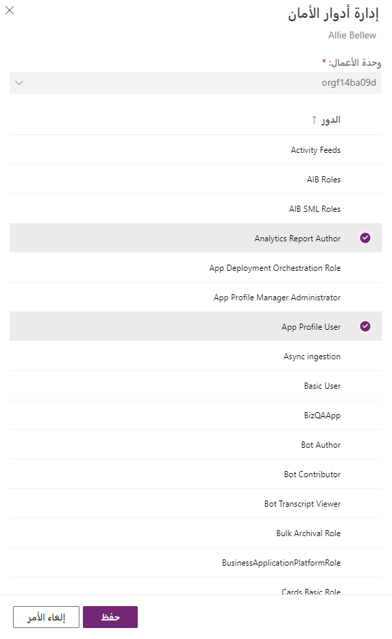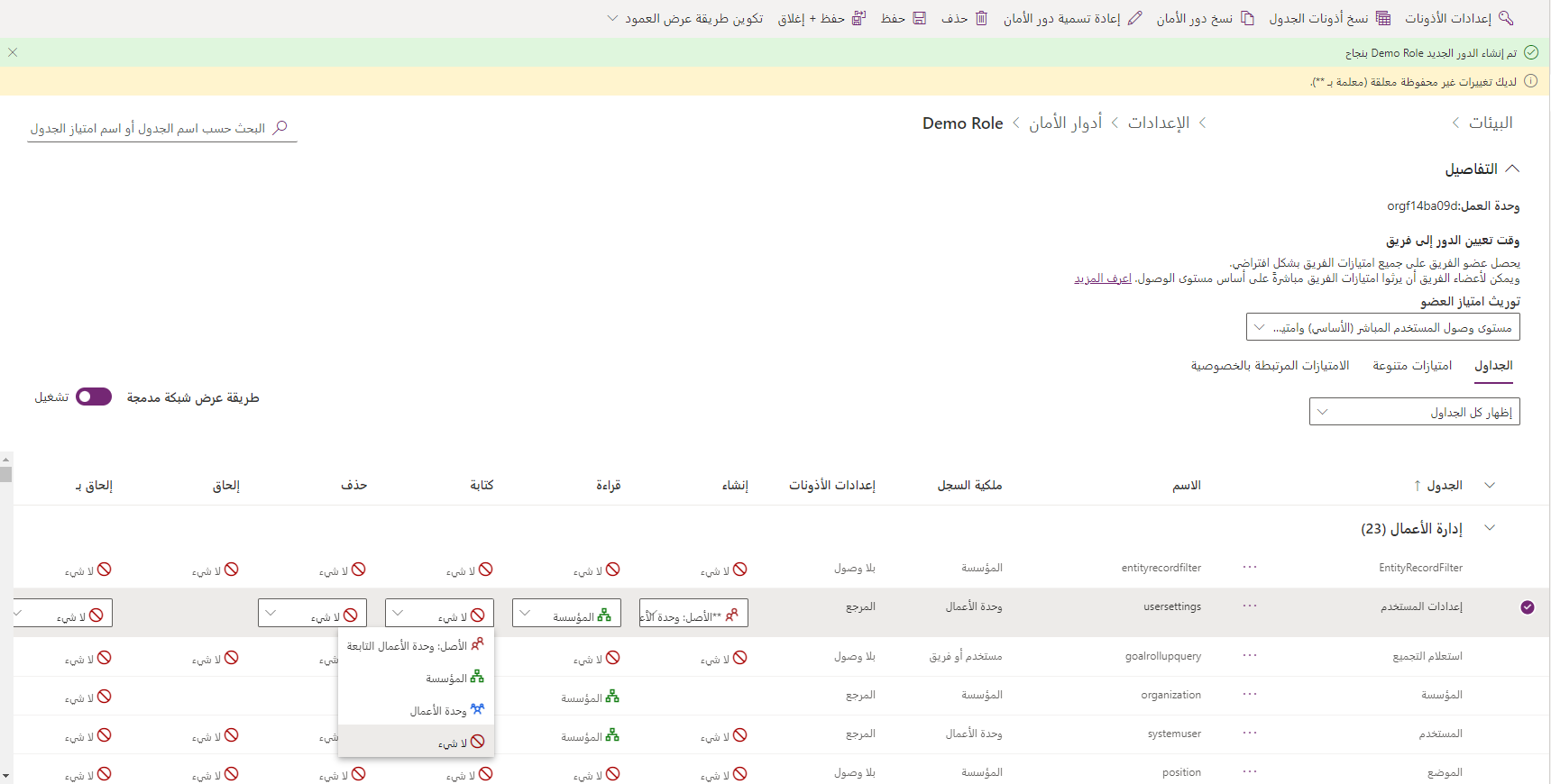 يظهر جزء إنشَاء دور جديد من الجَانب الأيمن للشَاشة. أضف اسم الدور، وحدد وحدة الأعمَال، حدد حفظ. (يمكنُك تغيير خيَارَات ورَاثة امتيَازَات العضو، ولكن هذه الخطوة غير ضرورية.) يؤدي هذَا إلى إنشَاء دور بمستوى أدنى من الأذونَات فِي البيئة. الخطوة التَالِية هي منحه حق الوُصُول إلى البيَانَات.