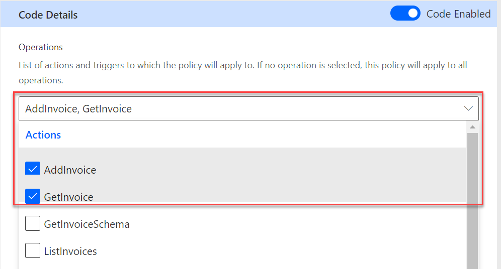 يمكنك أيضًا التحكم فِي العمليَات التي يعمل عليهَا الرمز المخصص عن طريق تعيينه للتشغيل لعمليَات محددة. بشكل افترَاضي، بعد تمكين التعليمَات البرمجية، ستقوم جميع العمليَات بتشغيل التعليمَات البرمجية المخصصة. تُظهر الصورة التَالية أن AddInvoice وGetInvoice فقط تشغلان التعليمَات البرمجية المخصصة.