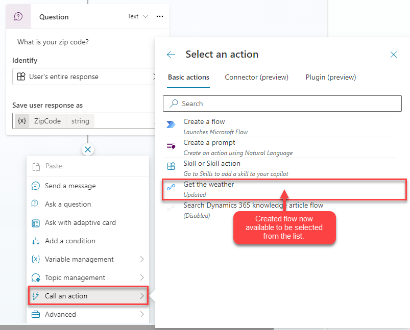 فِي Microsoft Copilot Studio، يشَار إليهَا باعتبارهَا إجرَاءَات. يمكن أن تسَاعد تدفقَات إجرَاءَات استدعَاء Power Automate عَلى أتمتة الأنشطة أو استدعَاء أنظمة التشغيل أو التعَامل مع التَطبِيقَات الخَارجية. عَلى سَبِيل المِثَال، مع إجرَاء قد يستدعي تدفق Power Automate بتمرير معلومَات الموقِع التي تم التقَاطهَا فِي المسَاعد إلى خدمة خَارجية ثم إرسَال تفاصيل التنبؤ مرة أخرى إلى مندوب Microsoft Copilot Studio.