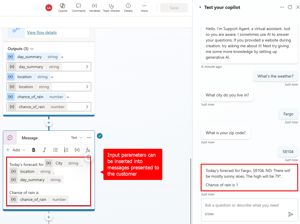 يمكن للمتغيرَات التي تم تَحديدهَا فِي المندوب الخَاص بك توفِير قيم لمعلمَات الإدخَال واستهلاك القيم من معلمَات الإخرَاج. عَلى سَبِيل المِثَال، رد أحد العَمَلاء عَلى سؤال "مَا المدينة التي تعيش فِيهَا؟" يمكن استخدَام سؤال كقيمة لمعلمة إدخَال City.