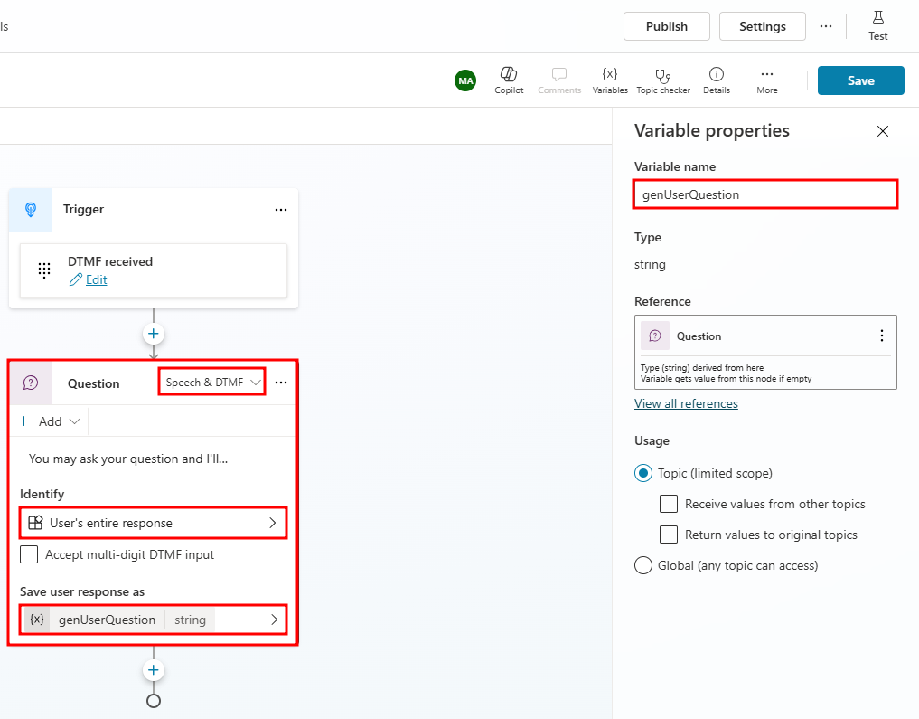وأخيرًا، قُم بإضَافة عقدةِ الإجَابَات التَولِيديَّة بَعد عُقدةِ السُؤال وقم بتعيين قيمَة الإدخَال إلى متغير genUserQuestion الخَاص بك. يمكن تخصيص عقد الإجَابات التوليدية بشكل أكبر عن طريق تحديد مصَادر المعرفة الخَاصة بهَا وإذا كنت تريد أن يستخدم المندوب معرفته العَامة. باستِخدَام إعدَادَات تَحسِين الصُوت فِي Copilot Studio، يمكنُ للمَندوبِ أيضًا تَقدِيم رسَالة زمنِ الانتِقَال لمَلء الوَقتِ وإبلاغ المُستَخدِم بأنَّ المَندوبَ يقومُ بإنشَاء الإجَابَة.