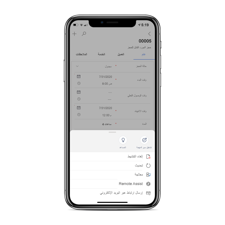 تعمل هذه الميزة عَلى تبسيط قدرة العَامل عَلى الحصول عَلى المسَاعدة وتضمن توفر معلومَات أمر العمل ذَات الصلة فِي Dynamics 365 Remote Assist. كمَا يسمح للعَامل بإرسَال معلومَات مكَالمة Remote Assist إلى الجدول الزمني لأمر العمل.
