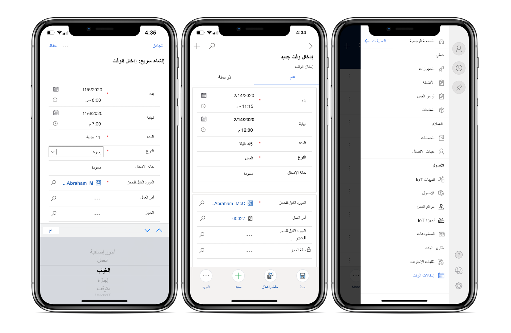 فيمَا يلي لقطة شَاشة توضح كيفِية إنشَاء إدخَال الوقت فِي تطبيق Field Service Mobile.