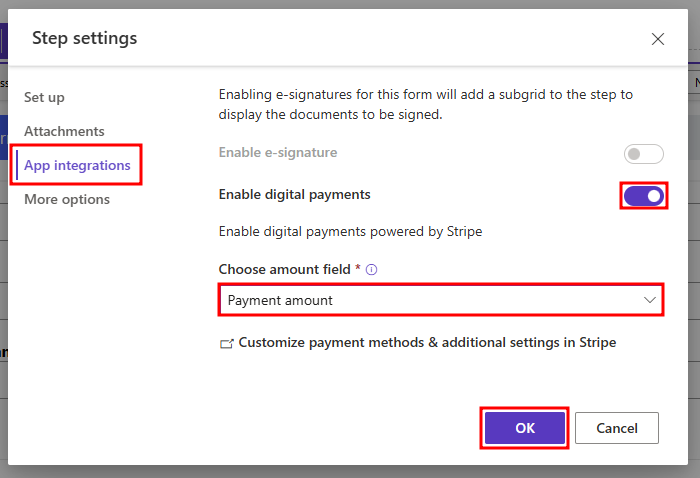 انتقل إلى تكَاملات التطبيقَات من نَافذة التنقل اليسرى، وحدد مفتَاح التبديل الموجود بجوار تمكين المدفوعَات الرقمية لتَشغيل تكَامل Stripe. حدد مبلغ الدفعلحقل اختيَار المبلغ، ثم حدد موافق لإكمَال النموذج.