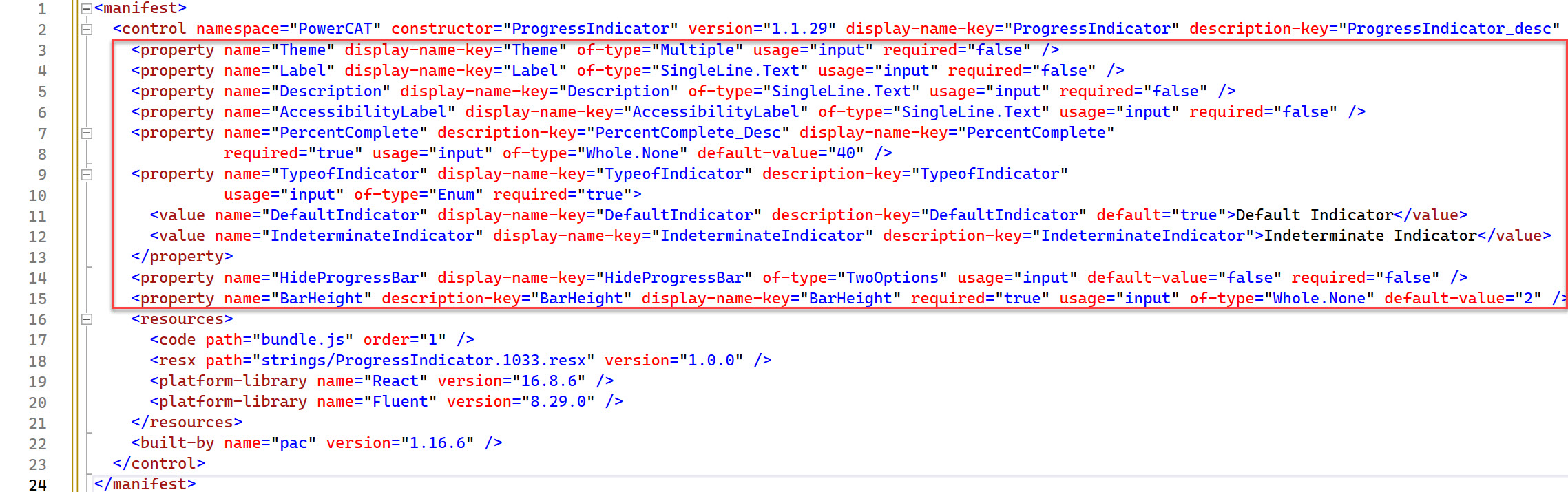 يعد تكوين بيَان المكون خطوة أسَاسية فِي بنَاء مكون التعليمَات البرمجية. تتم تهيئة ملف ControlManifest.Input.xml ببعض اختيَارَاتك، مثل اسم المكون ونوعه، عِندَ استخدَام الأمر pac pcf init. لا يزَال يتعين عليك تخصيص الملف لتحديد أي خصَائص وموارد تستخدمهَا ولتمكين أي مِن ميزَات إطَار العمل التي تستخدمهَا فِي المكون.