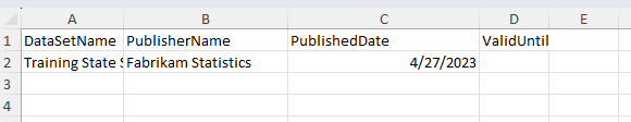 اسم مجموعة البيانات اسم الناشر تاريخ النشر ValidUntil تدريب بيانات مدارس الدولة إحصائيات Fabrikam 4/27/2023 يجب أن تشبه ورقة عمل DataSetMetadata لقطة الشاشة التالية.