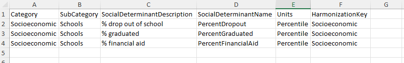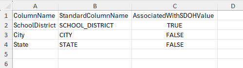 ColumnName StandardColumnName AssociatedWithSDOHValue منطقة تعليمية المنطقة_التعليمية صحيح المدينة CITY FALSE State STATE FALSE يجب أن تشبه ورقة عمل LocationConfiguration الصورة التالية.