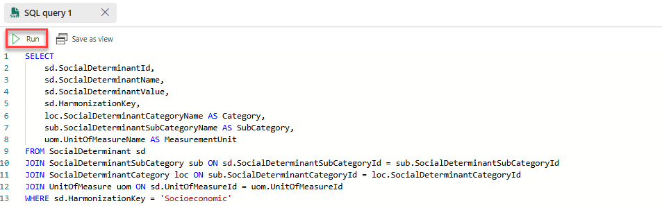 SELECT sd.SocialDeterminantId, sd.SocialDeterminantName, sd.SocialDeterminantValue, sd.HarmonizationKey, loc.SocialDeterminantCategoryName AS Category, sub.SocialDeterminantSubCategoryName AS SubCategory, uom.UnitOfMeasureName AS MeasurementUnit FROM SocialDeterminant sd JOIN SocialDeterminantSubCategory sub ON sd.SocialDeterminantSubCategoryId = sub.SocialDeterminantSubCategoryId JOIN SocialDeterminantCategory loc ON sub.SocialDeterminantCategoryId = loc.SocialDeterminantCategoryId JOIN UnitOfMeasure uom ON sd.UnitOfMeasureId = uom.UnitOfMeasureId WHERE sd.HarmonizationKey = 'Socioeconomic'حدد تشغيل.