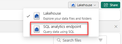 حدد Lakehouse في الزاوية العلوية اليسرى ثم قم بالتبديل إلى نقطة نهاية تحليلات SQL.