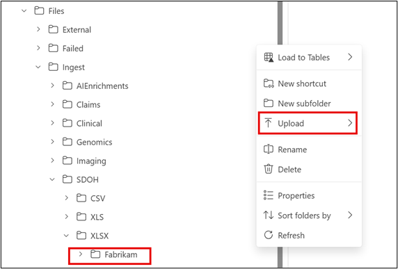 قم بتوسيع Files > Ingest > SDOH > XLSX ثم اختر علامة الحذف (...) الموجودة على العقدة. حدد مجلد فرعي جديد.